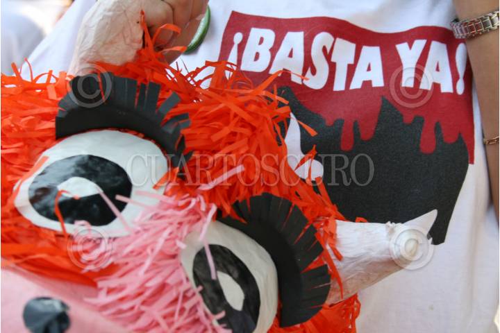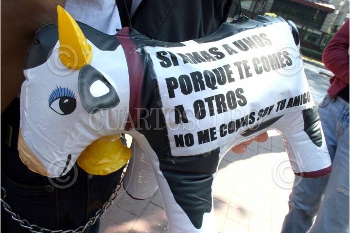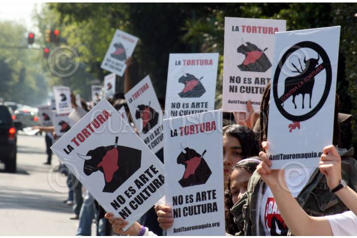 MÉXICO D.F., 02FEBRERO2008.- Miembros y simpatizantes de las Asociaciones Protectoras de Animales de Mexico se manifestaron en contra de las corridas de toros que se realizan en La Plaza de Toros Mexico, los manifestantes formaron una valla sobre Avenida Insurgentes en el tramo del Parque Hundido hasta la estacion del metrobús Ciudad Deportiva. FOTO:RICARDO CASTELAN/CUARTOSCURO.COM