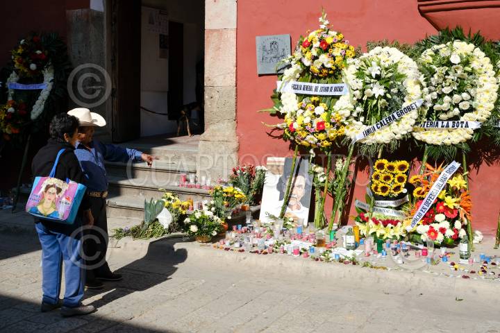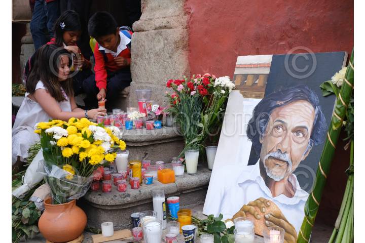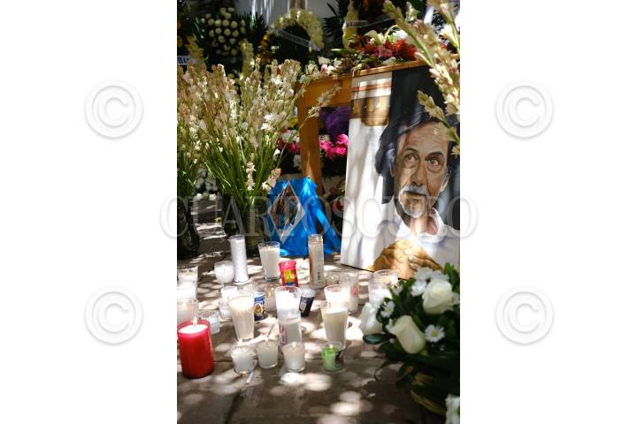 OAXACA, OAXACA, O7SEPTIEMBRE2019.- Amigos, vecinos, turistas, estudiantes y oaxaqueños continúan visitando y dejando flores, cartas y veladoras en la ofrenda en memoria del del artista plástico Francisco Toledo, quién murió el jueves pasado a los 79 años. Se encuentra en el patio central del Instituto de Artes Gráficas de Oaxaca (IAGO), lugar que fundó e inauguró en 1988. FOTO: GRACIELA LÓPEZ /CUARTOSCURO.COM