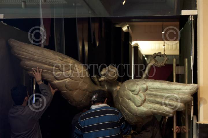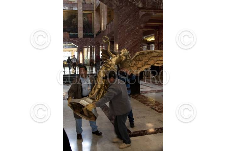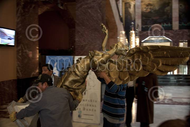 MÉXICO, D.F., 09FEBRERO2012.- Trabajadores de Palacio de Bellas Artes trasladan una replica del icónico Ángel de la Independencia, que en realidad es una Victoria Alada , tras la conclusión de la conferencia sobre el montaje de “El Lago de los Cisnes” en el Palacio de las Bellas Artes. La coreografía de esta puesta escena esta a cargo de Lev Ivanov y Marius Petipa, con música de Piotr Tchaikovsky, y se estrenará enn la Isleta del Viejo Lago de Chapultepec. El espectáculo único en el mundo, ofrecerá 22 funciones en esta temporada, la cual irá del 24 de febrero al 25 de marzo, anunció Sylvie Reynaud directora de la Compañía Nacional de Danza del Instituto Nacional de Bellas Artes. FOTO: MOISÉS PABLO/CUARTOSCURO.COM