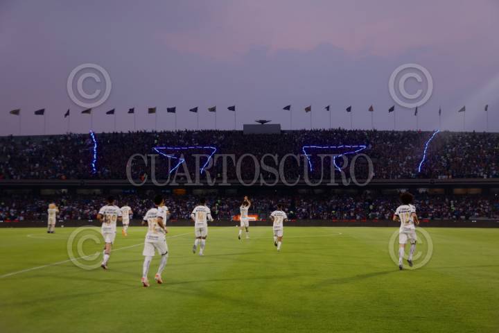 CIUDAD DE MÉXICO, 09MAYO2024. El quiosco de Pumas salta a la cancha mientras en la tribuna se dibuja un puma con luces neón previo al partido de fútbol de ida, Pumas vs Cruz Azul correspondiente a la fase de cuartos de final del Torneo Clausura 2024 de Liga BBVA MX, en el Estadio Olímpico Universitario. FOTO: EDGAR NEGRETE LIRA/CUARTOSCURO.COM