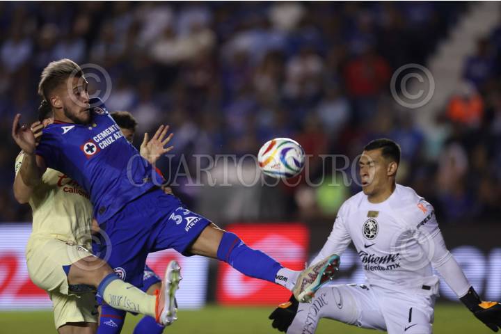 CIUDAD DE MÉXICO, 23MAYO2024. El jugador de la Maquina Celeste, Gonzalo Piovi remata un balón a la salida del portero Luis Ángel Malagón de las Águilas durante el partido de fútbol Cruz Azul vs América correspondiente a la final de ida del Torneo Clausura 2024 de la Liga BBVA MX, en el Estadio Ciudad de los Deportes. FOTO: EDGAR NEGRETE LIRA/CUARTOSCURO.COM