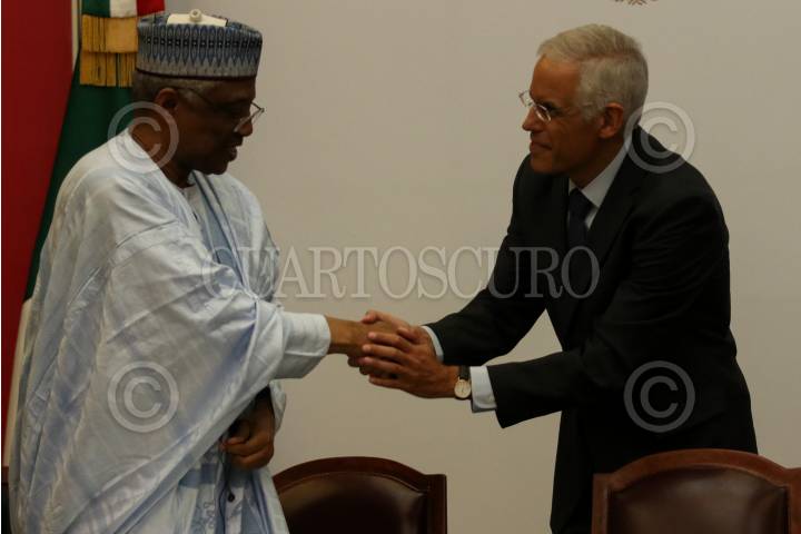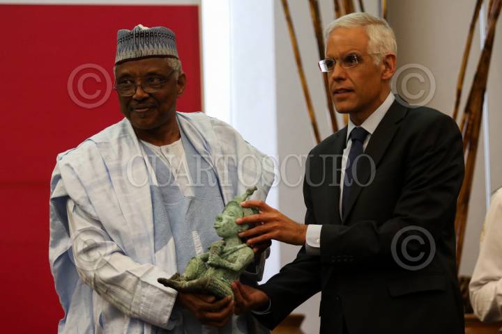 Aminu Iyawa, embajador de Nigeria en México, y Julián Ventura, susecretario de Relaciones Exteriores, durante la entrega de bienes culturales incautados.