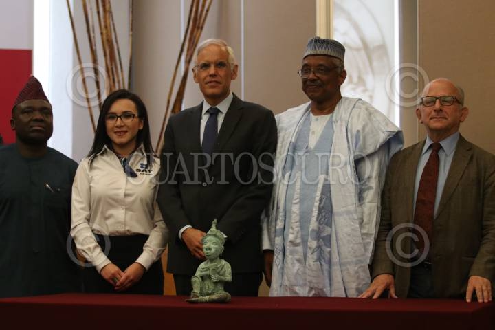 Aminu Iyawa, embajador de Nigeria en México; Julián Ventura, susecretario de Relaciones Exteriores, y Diego Prieto, director del Instituto Nacional de Antropología e Histori, encabezaron la entrega de bienes culturales incautados.