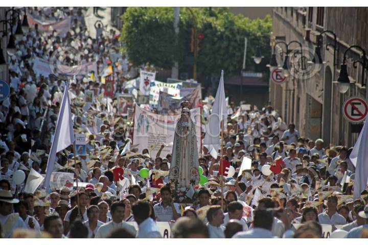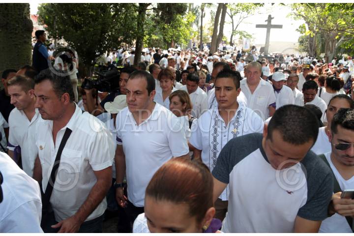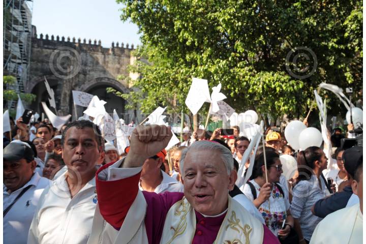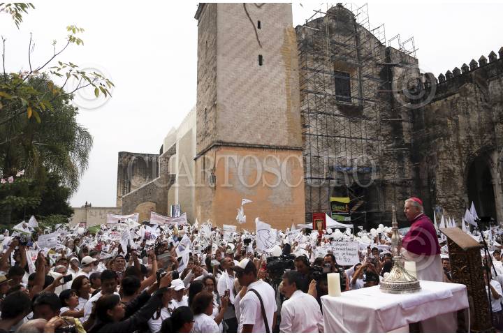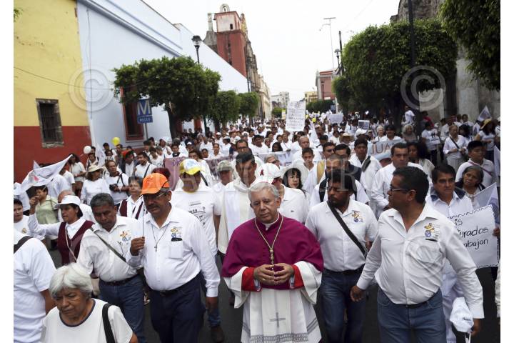 CUERNAVACA, MORELOS, 21MAYO2016.-Convocados por la iglesia católica, miles de personas marcharon este día para exigir paz en el estado. Encabezados por el obispo Ramón Castro y Castro, partieron de cuatro puntos de la ciudad para desembocar en la catedral, donde se guardaron dos minutos de silencio por las víctimas de la violencia. En la marcha, pudieron observarse mantas que desaprueban la reciente ley que permite el matrimonio entre personas del mismo sexo. FOTO: MARGARITO PÉREZ RETANA /CUARTOSCURO.COM