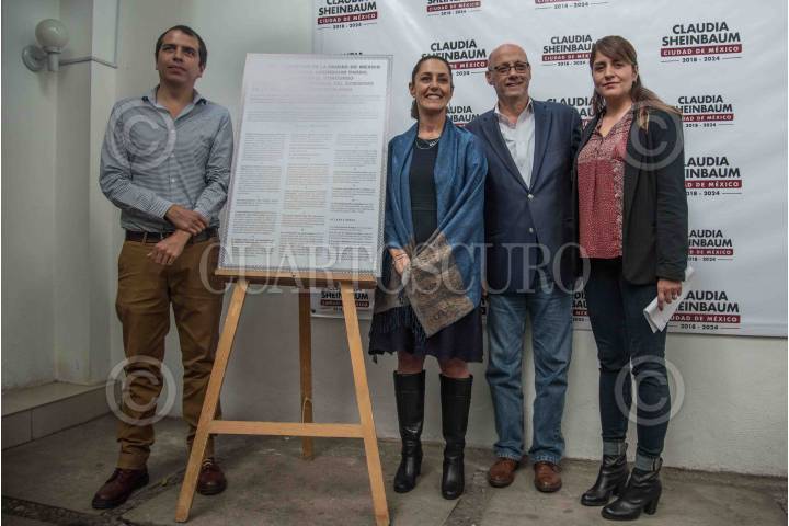 CIUDAD DE MÉXICO, 11SEPTIEMBRE2018.- El artista Santiago Robles; Claudia Sheinbaum, jefa de gobierno electa de la capital; Carlos Mackinlay, próximo titular de turismo capitalino y Teresa Del Mazo, en conferencia de prensa compartieron la convocatoria del concurso de la imagen institucional del gobierno entrante durante el periodo 2018-2024. La convocatoria va dirigida a publicistas, diseñadores, mercadólogos, artistas visuales y plásticos que residan en la capital. FOTO: MARIO JASSO /CUARTOSCURO.COM
