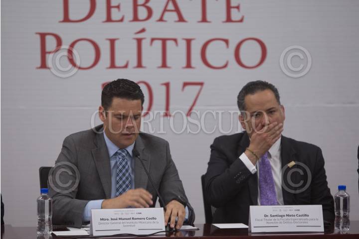 CIUDAD DE MÉXICO, 01AGOSTO2017.- José Manuel Romero Coello, director general del Instituto Mexicano de la Juventud, y Santiago Niesto Castillo, titular de la Fiscalia Especializada para la atención de Delitos Electorales, encabezaron la conferencia de prensa sobre el Debate Político 2017, en el que se convoca a jóvenes de toda la República para iniciar en la participación de la democracia en el país. FOTO: TERCERO DÍAZ /CUARTOSCURO.COM