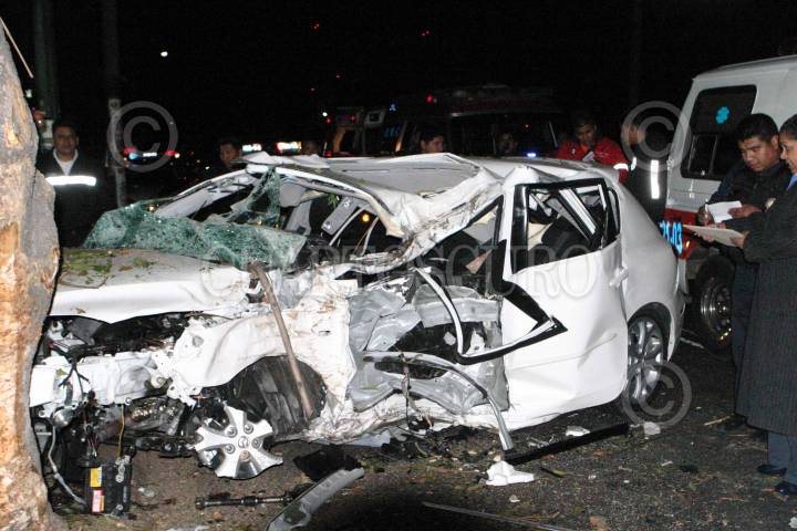 MÉXICO, D.F., 03JUNIO2010.- Un sujeto y dos Mujeres de entre 20 y 30 años, pierden la vida al impactar el auto tipo Tsuru en el que viajaban contra un poste en el kilómetro 12 + 800 de la Autopista México - Tulancingo, en el Poblado de Santa Catarina perímetro del municipio de Acolman. De dicho accidente fueron trasladadas otras tres personas con lesiones graves en helicóptero a los hospitales de Balbuena y Xoco en el Distrito Federal. FOTO: LUIS CARBAYO/CUARTOSCURO.COM