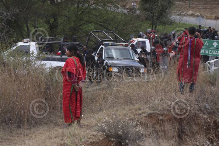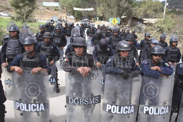 TLAXIACO, OAXACA, 27ENERO2012.- Elementos de la Policía Estatal, bajo el mando del Comisionado de dicha coorporación, César Cruz Alfaro realizan un retén en el paraje el Ojite donde impiden el paso a la "Caravana del Regreso" integrada por indígenas triquis. FOTO: ARTURO PÉREZ ALFONSO/CUARTOSCURO.COM