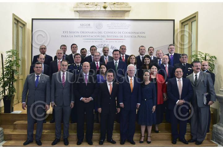 CIUDAD DE MÉXICO, 09JUNIO2016.- A nueve días de la implementación del nuevo Sistema de Justicia Penal en todo el país, el Secretario de Gobernación, Miguel Ángel Osorio Chong, destacó que cuando el gobierno escucha a los ciudadanos, se logran grandes transformaciones como lo es este nuevo mecanismo. Los ciudadanos, agregó, contarán con un Sistema que dice adiós a la impunidad y da la bienvenida a la justicia plena para los mexicanos. Al encabezar la Décima Sexta Sesión Ordinaria del Consejo de Coordinación para la Implementación del Sistema de Justicia Penal, el titular de esta dependencia detalló que con el trabajo realizado se manda un mensaje conjunto a las y los mexicanos, pues se hizo un gran esfuerzo, pese a las dificultades enfrentadas. FOTO: SEGOB /CUARTOSCURO.COM