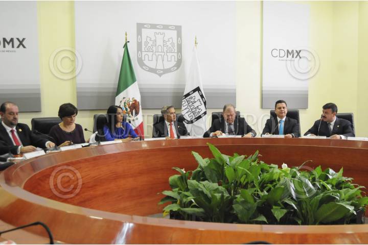 CIUDAD DE MÉXICO, 16JUNIO2016.- El procurador Rodolfo Ríos; Patricia Mercado, secretaria de gobierno capitalino; la secretaria ejecutiva del Sistema de Coordinación del Sistema de Justicia Penal, María de los Ángeles Fromow; Miguel Ángel Mancera, jefe de gobierno capitalino; Edgar Elías Azar, presidente del Tribunal Superior de Justicia de la ciudad de México; Manuel Granados, consejero jurídico y de Servicios Legales, e Hiram Almeida, titular de la secretaría de seguridad pública, durante la conferencia de prensa para anunciar la implementación total del sistema de justicia penal acusatorio en la ciudad de México. FOTO: DIEGO SIMÓN SÁNCHEZ /CUARTOSCURO.COM