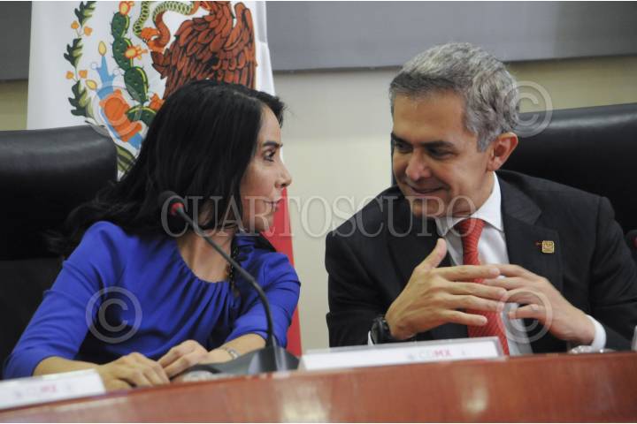 CIUDAD DE MÉXICO, 16JUNIO2016.- La secretaria ejecutiva del Sistema de Coordinación del Sistema de Justicia Penal, María de los Ángeles Fromow y Miguel Ángel Mancera, jefe de gobierno capitalino, durante la conferencia de prensa para anunciar la implementación total del sistema de justicia penal acusatorio en la ciudad de México. FOTO: DIEGO SIMÓN SÁNCHEZ /CUARTOSCURO.COM