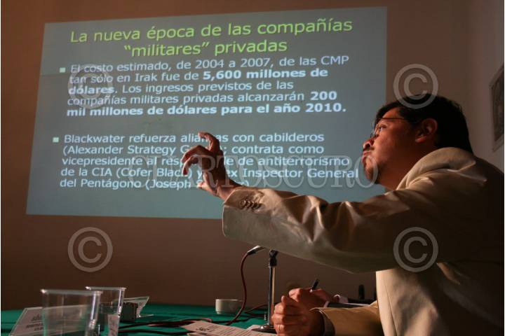 MÉXICO, D.F., 21JULIO2008.- Adolfo Miranda Castillo, presidente del centro de estudios en seguridad publica, durante la conferencia de prensa "El riesgo que implica la posible vinculación de intereses privados con las fuerzas armadas de México", donde se denuncio que empresas militares privadas han desarrollado fuertes vínculos con la explotación de recursos naturales por compañías extranjeras, en la imagen se muestran estadísticas de la nueva época de las compañías militares. FOTO: RICARDO CASTELAN /CUARTOSCURO.COM