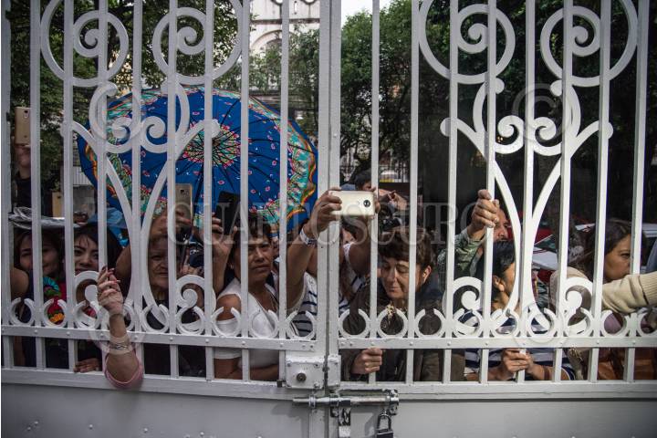 CIUDAD DE MÉXICO, 20JULIO2018.- Andrés Manuel López Obrador, virtual presidente electo, ofreció esta noche una conferencia en la que indicó que el partido Morena impugnará ante el TEPJF por multa impuesta por el Instituto Nacional Electoral (INE) que redondea 197 millones de pesos. Por otro lado, Andrés Manuel, confirmó la visita de la canciller canadiense Chrystia Freeland. En la imagen, personas miran a través de la reja para poder observar al virtual presidente electo. FOTO: MARIO JASSO /CUARTOSCURO.COM