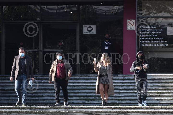 Gibrán Ramírez y su equipo de trabajo, saliendo de oficialía de partes del INE en Tlalpan. FOTO: ROGELIO MORALES /CUARTOSCURO.COM