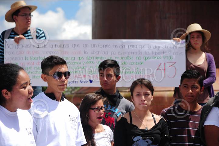 ZACATECAS, ZACATECAS, 26SEPTIEMBRE2015.- Jóvenes estudiantes de diferentes escuelas realizaron una marcha que avanzó por el boulevard Adolfo López Mateos y finalizó en la plaza Bicentenario exigiendo justicia por la desaparición de los 43 normalistas en Iguala, Guerrero. Con pancartas y pintas sobre la avenida los estudiantes recordaron a sus compañeros caídos hace un año. FOTO: ISABEL MATEOS /CUARTOSCURO.COM