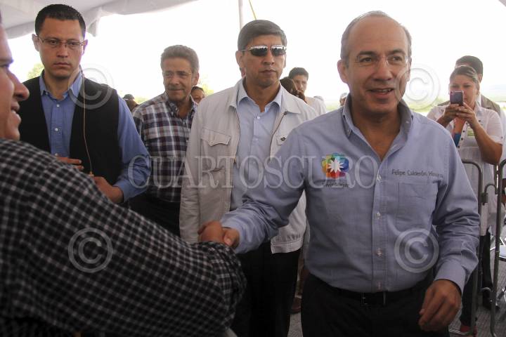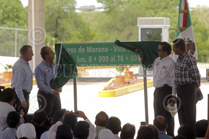 LAGOS DE MORENO, JALISCO, 25JULIO2012.- Este medio día, en gira de trabajo por el estado, el Presidente de la República, Felipe Calderón Hinojosa, inauguro 78 kilómetros de tramo carretero que va de Lagos de Moreno a Las Amarillas, Villa de Arriaga, San Luis Potosí, obra que beneficia también a Guanajuato y no solo a estos estados, "sino a todos los mexicanos", menciono el mandatario nacional, al evento acudieron los Gobernadores de Jalisco, Emilio González Márquez y San Luis Potosí, Fernando Toranzo. FOTO: FERNANDO CARRANZA /CUARTOSCURO.COM