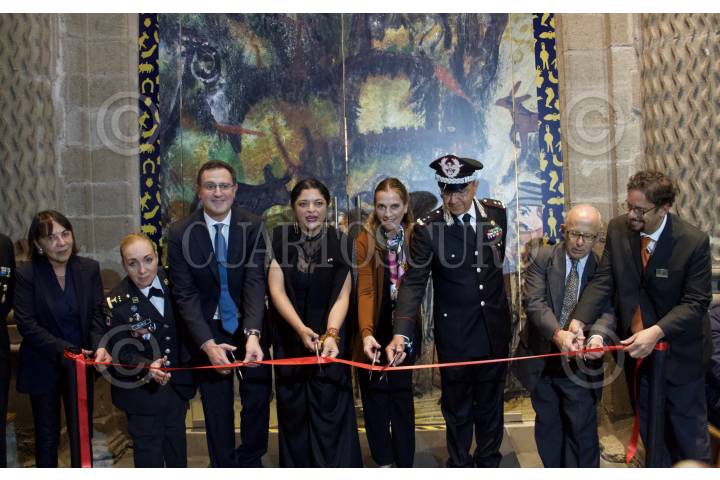 CIUDAD DE MÉXICO, 26AGOSTO2019.- Patricia Trujillo, coordinadora operativa de la Guardia Nacional; Alejandra Frausto; Secretaria de Cultura Federal; Beatriz Müller, encargada de la Coordinación Nacional de Memoria Histórica y Cultural de México y Diego Prieto, director general del INAH, durante el corte de listón de la exposición Memoria de milagros, exvotos mexicanos. Cabe destacar que las piezas expuestas son patrimonio recuperado por el Instituto Nacional de Antropología e Historia (INAH), la muestra estará abierta al público durante tres meses en el Museo Nacional de las Culturas del Mundo. FOTO: ROGELIO MORALES /CUARTOSCURO.COM