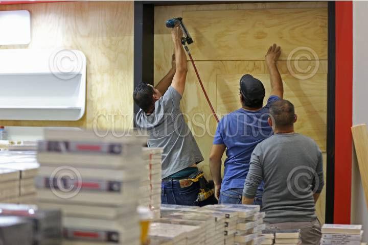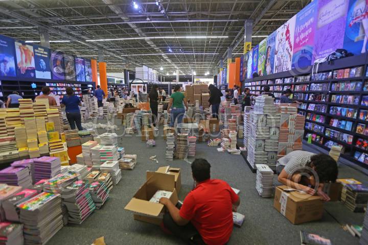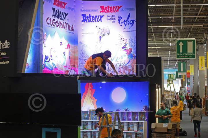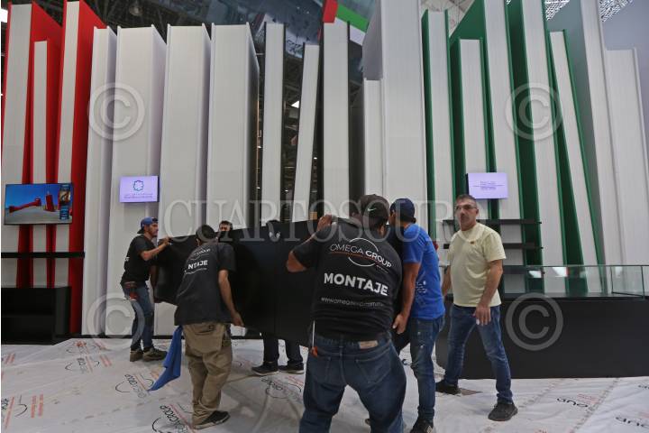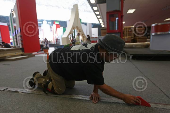 Personal contratado por la Feria Internacional del Libro de Guadalajara (FIL), trabajan en los últimos detalles del montaje de stands y pabellones para la edición 36 de la FIL.