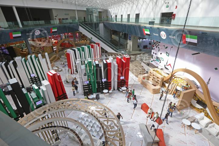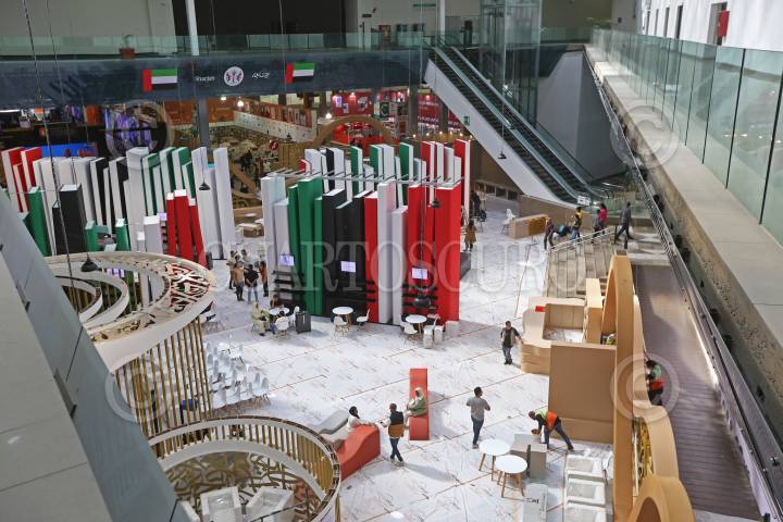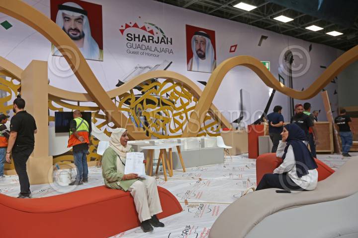 Dos mujeres ciudadanas de Sharjah conversan en el pabellón del país invitado mientras, personal contratado por la Feria Internacional del Libro de Guadalajara (FIL), trabajan en los últimos detalles del montaje de stands y pabellones para la edición 36 de la FIL.
