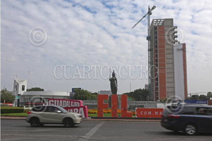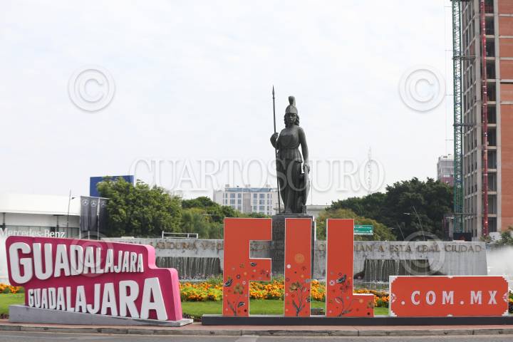 Letrero de la Feria Internacional del Libro de Guadalajara (FIL), en la Glorieta de la Minerva, a un día de la inauguración de la edición 36.