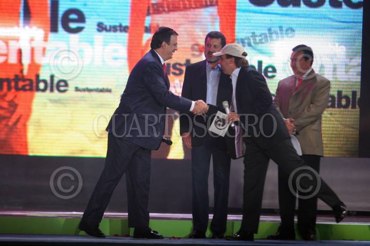 QUERÉTARO, QUERÉTARO, 05FEBRERO2011.- El arquitecto Teodoro González de León, esta mañana el gobernador del estado le reconoció publicamente la creación de esta obra del Centro de Convneciones, que el sexenio anterior había sido dada al despacho del arquitecto Moyao (quinto lugar en la licitación). Finalmente esta ocasión las "diferencias irreconciliables" dieron la razón a González de León quién aun mantiene la demanda por plagio del teatro. El costo global de la obra es de 624 millones de pesos. En el marco de la inauguración del complejo también conocido como Ciudad de las Artes, a la que asistió el gobernador del estado José Calzada Rovirosa y el Secretario de Energía Federal José Antonio Meade acompañados por los gobernadores Enrique Peña Nieto del estado de México y Carlos Lozano de Aguascalientes, inauguraron del Centro de Convenciones y Congresos de Querétaro. FOTO: DEMIAN CHÁVEZ/CUARTOSCURO.COM