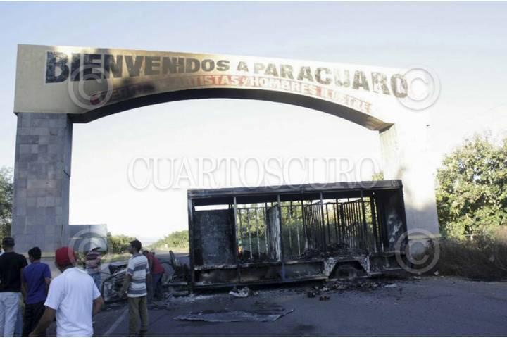 PARÁCUARO, MICHOACÁN, 09ENERO2014.- Civiles quemaron tres camiones de diferentes empresas en la carretera Cuatro Caminos-Apatzingán en la entrada al pueblo, los manifestantes exigían la salida de las autodefensas de la cabecera del poblado ya mencionado. FOTO: CUARTOSCURO.COM