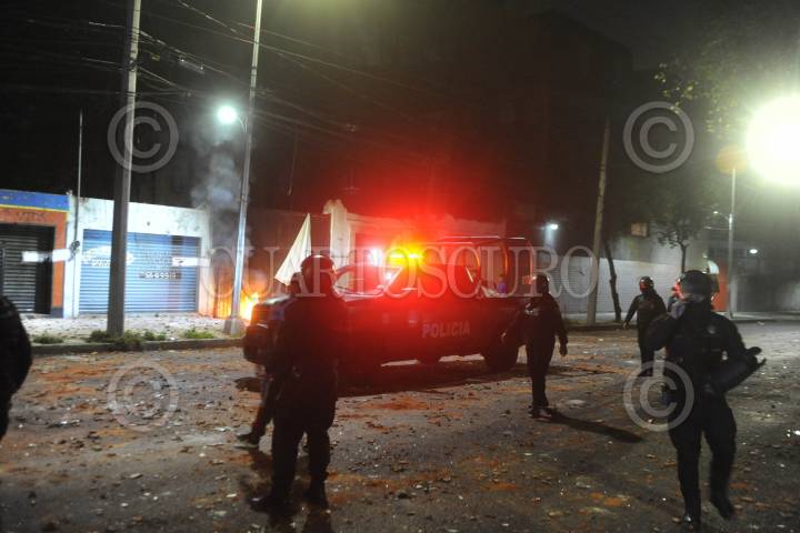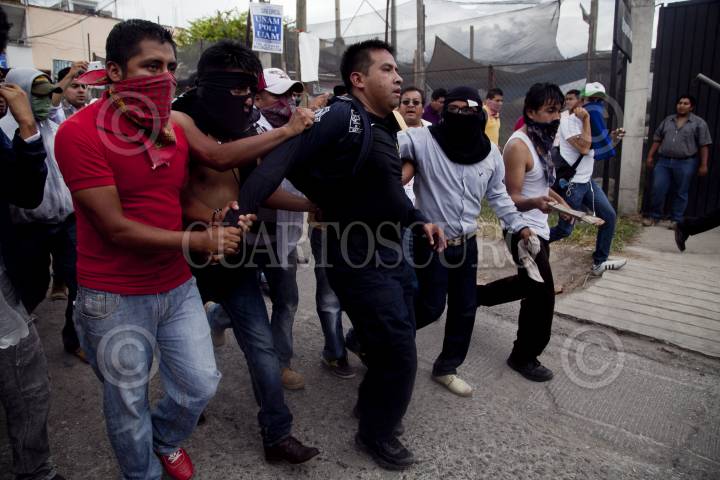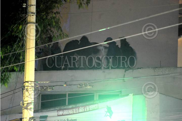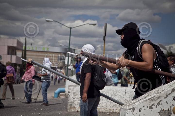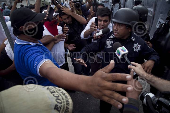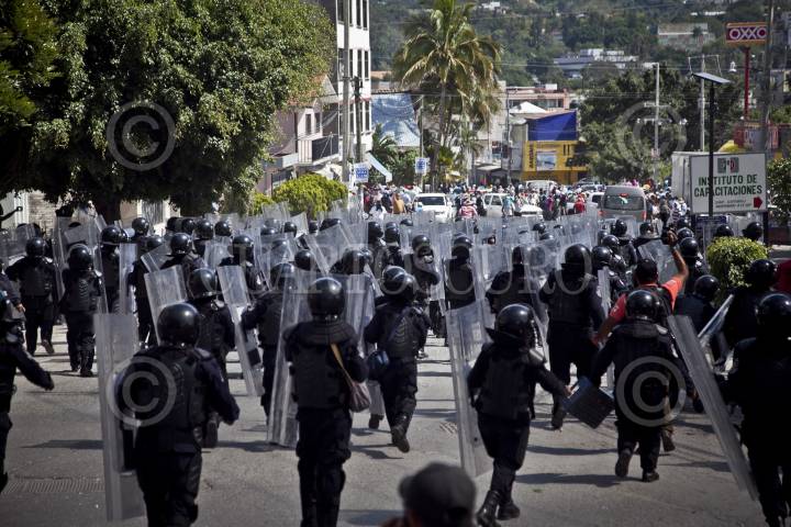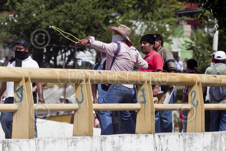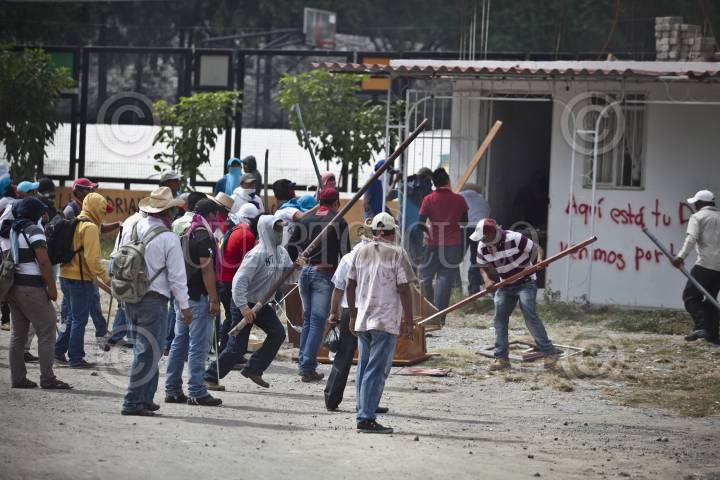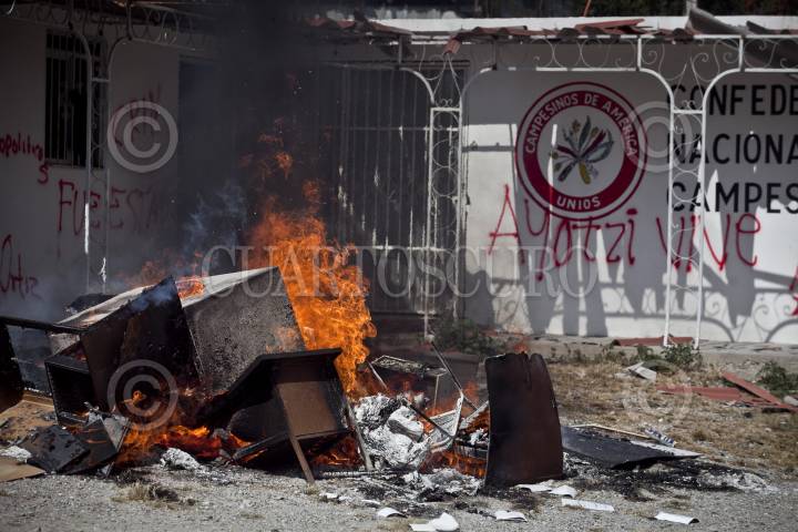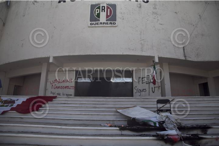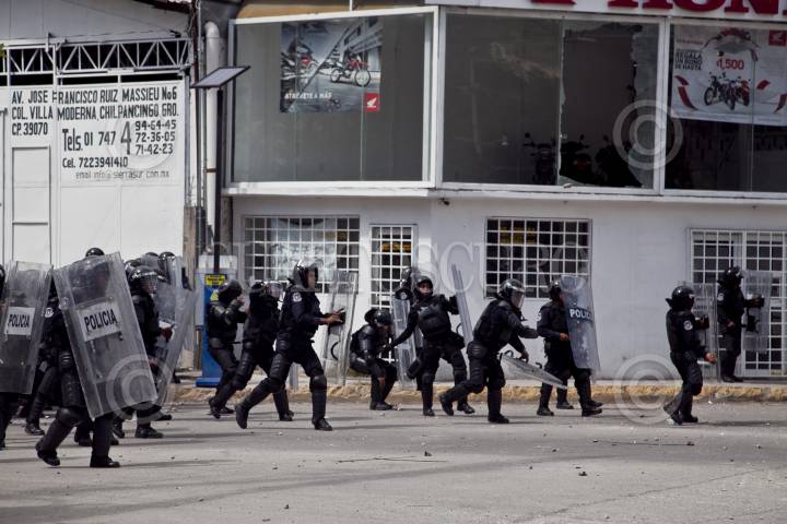 CHILPANCINGO, GUERRERO 11NOVIEMBRE2014.- Integrantes de la CETEG, MPG y normalistas en apoyo a Ayotzinapa, quemaron las instalaciones del PRI en Guerrero y se enfrentaron con elementos de la policía federal, para exigir que se aclaren los hechos con los 43 estudiantes desparecidos en Iguala. FOTO: RASHIDE FRIAS / CUARTOSCURO.COM