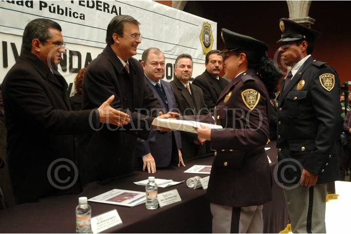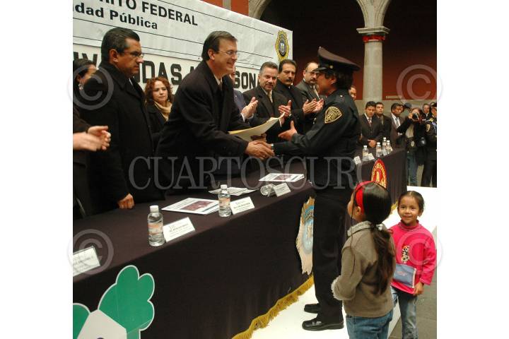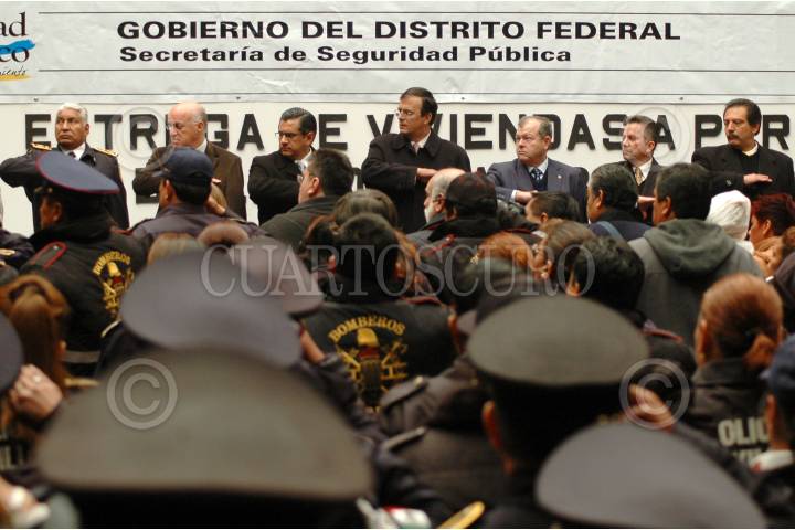 MÉXICO D.F., 04ENERO2008.- El jefe de gobierno capitalino Marcelo Ebrard Casaubon acompañado del jefe de Seguridad Pública Joel Ortega Cuevas, realizaron la entrega de viviendas y viajes de incentivo a elementos de Seguridad Pública y del H. Cuerpo de Bomberos en el Museo de la Ciudad de México. FOTO: RODOLFO ANGULO/CUARTOSCURO.COM