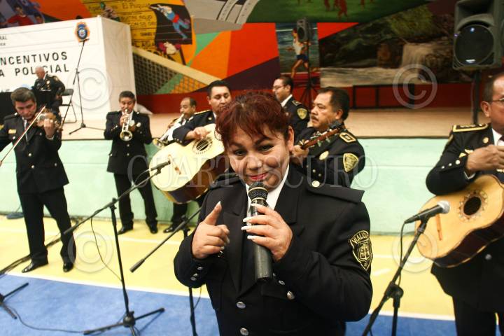 MÉXICO, D.F., 23SEPTIEMBRE2009.- Una integrante de la Secretaria de Seguridad pública del Distrito Federal, canta junto con un mariachi, previo a la entrega de incentivos a la eficacia policial, realizado en un deportivo ubicado en la delegación Magdalena Contreras. FOTO: SAÚL LÓPEZ/CUARTOSCURO.COM