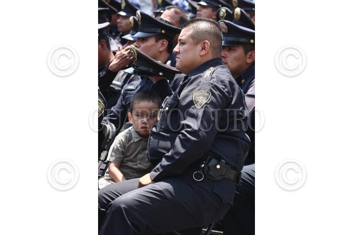 MÉXICO, D.F., 31MARZO2011.- Un policia cubre del sol a su hijo, durante la entrega de incentivos a la eficiencia policial a dos 2849 elementos adscritos a las subsecretarias de operación policial, inteligencia, participación ciudadana y prevención del delito. FOTO: SAÚL LÓPEZ/CUARTOSCURO.COM