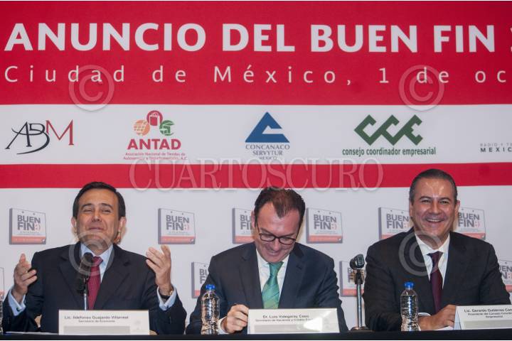 MÉXICO, D.F., 01OCTUBRE2014.- Enrique Solana Sentíes , Presidente de la Confederación de Cámaras Nacionales de Comercio, Servicios y Turismo (CONCANACO-SERVITUR), Ildefonso Guajardo Villarreal, secretario de Economía, Luis Videgaray, Secretario de Hacienda y Gerardo Gutiérrez Candiani, Presidente de Consejo Coordinador Empresarial, encabezaron la conferencia de prensa para anunciar el Buen Fin 2014 que se realizará del 14 al 17 de noviembre. FOTO: DIEGO SIMÓN SÁNCHEZ /CUARTOSCURO.COM