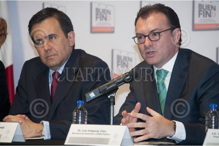 MÉXICO, D.F., 01OCTUBRE2014.- Ildefonso Guajardo Villarreal, secretario de Economía y Luis Videgaray, Secretario de Hacienda, durante la conferencia para anunciar el Buen Fin 2014 que se realizará del 14 al 17 de noviembre. FOTO: DIEGO SIMÓN SÁNCHEZ /CUARTOSCURO.COM