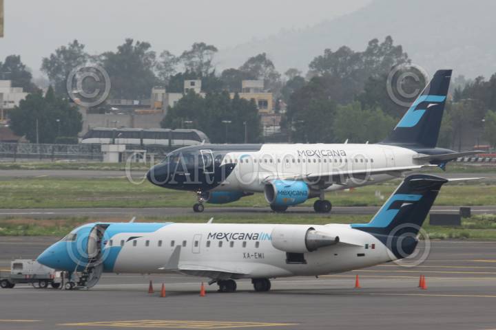 MÉXICO, D.F., 07AGOSTO2010.- Los trabajadores de la Compañía Mexicana de Aviación manifestaron su voluntad de ceder prestaciones, salario e incluso plazas, como vía para aligerar la crisis financiera de la aerolínea y evitar su posible cierre. Hasta el momento Mexicana de Aviación que se encuentra en concurso mercantil ha suspendido la venta de boletos, no así para sus filiales Mexicana Link y Mexicana Click que continúan operando de forma regular. En la imagen un avión de Mexicana de Aviación y uno de Mexicana Link. FOTO: RODOLFO ANGULO/CUARTOSCURO.COM