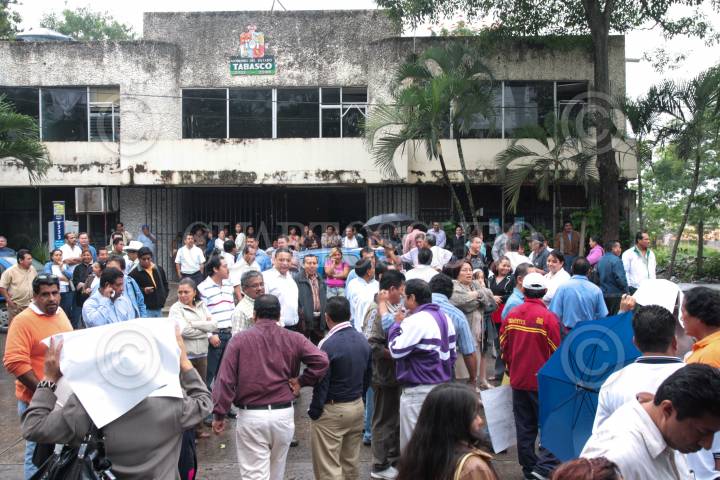 VILLAHERMOSA, TABASCO, 08ENERO2010.- Miembros del SITET continúan bloqueando con troncos y pancartas el velódromo de la ciudad deportiva. Ahora tomaron el edificio sede de la paguduria de Secretaría de Educación Pública local que se ubica de igual manera a un costado del bloqueo en donde amenazan continuar en su plantón por la falta de pago en sus aguinaldos. FOTO: MARCO POLO GUZMÁN HERNÁNDEZ/CUARTOSCURO.COM