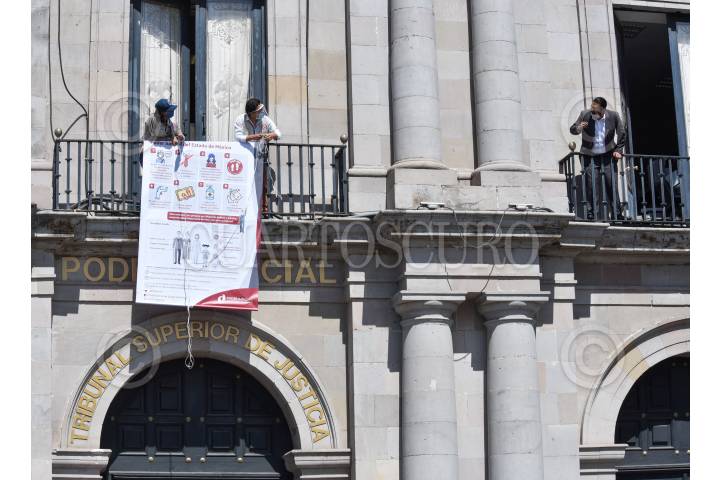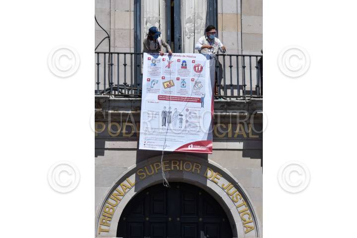Instalan manta en el TSJEM con indicaciones preventivas para poder acceder al inmueble y evitar contagios por COVID-19.