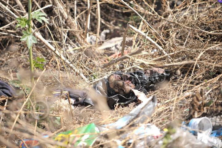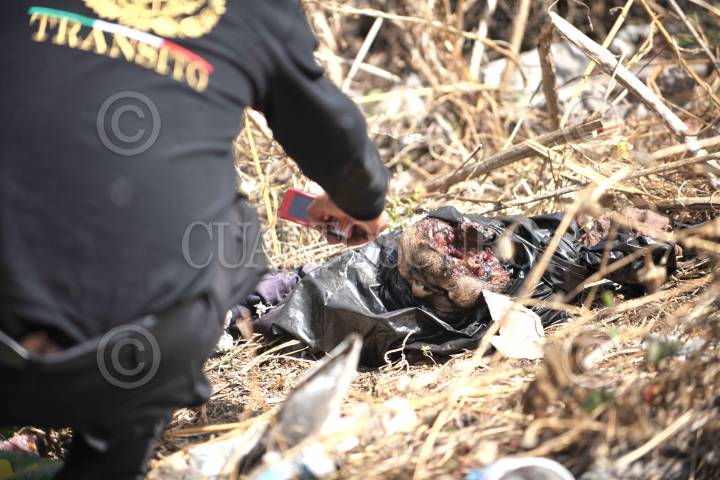 MÉXICO, D.F., 28FEBRERO2010.- Una cabeza fue descubierta cuando era comida por perros. Dicha testa se encontraba en una bolsa en color negro junto con cinco bolsas más que contenían los restos humanos lo que ocasiono fuerte movilización policíaca para checar la zona. Peritos Mexiquenses acudieron para tomar conocimiento de los hechos y realizar el levantamiento de dichas bolsas. Versión extraoficial indicaron que fueron dos los cuerpos destazados. FOTO: LUIS CARBAYO/CUARTOSCURO.COM