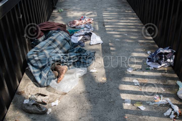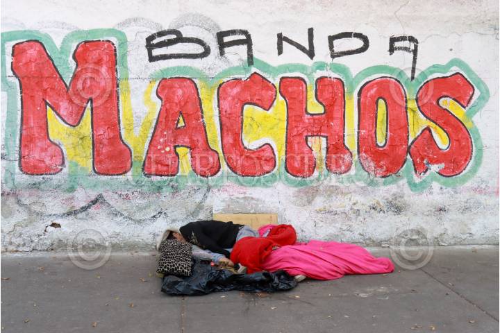 Un indigente duerme en la calle después de ingerir alcohol etílico.