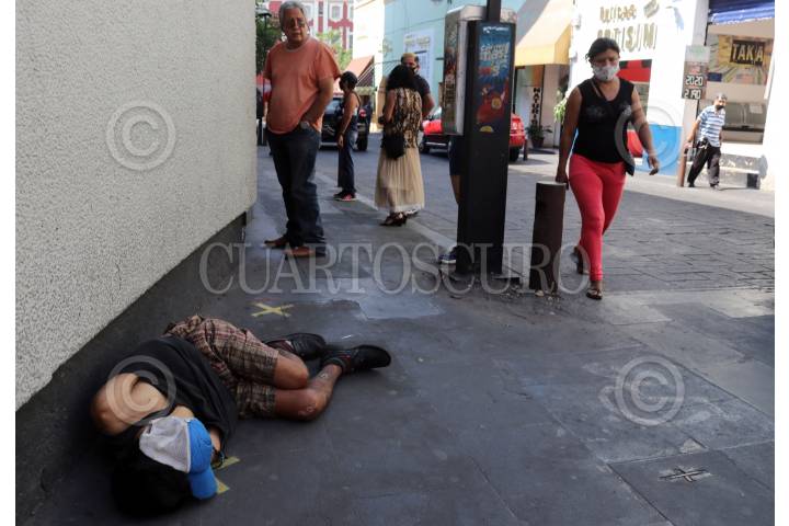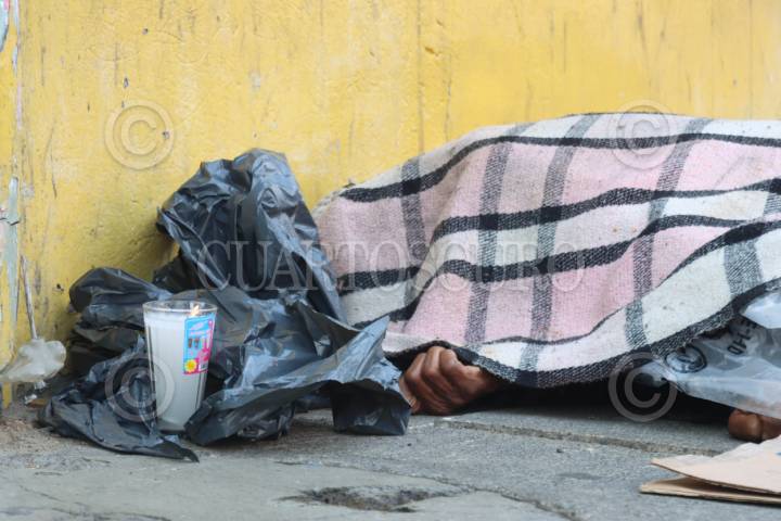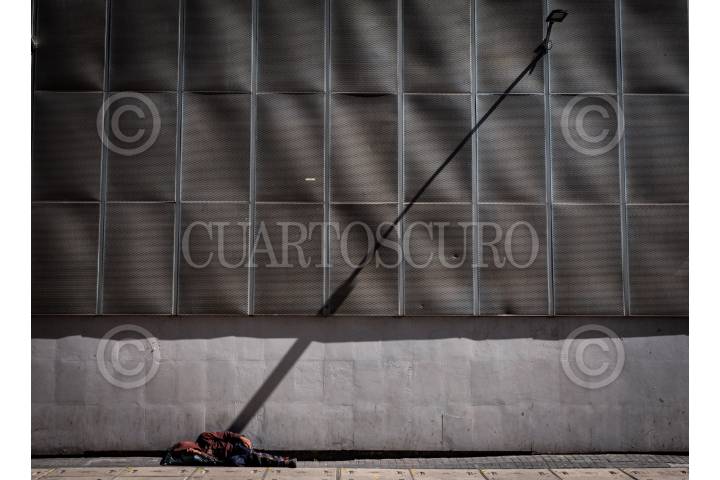 La sombra de una lámpara apunta a un joven en situación de calle que duerme sobre la acera de Luis Moya en la colonia Centro Histórico.