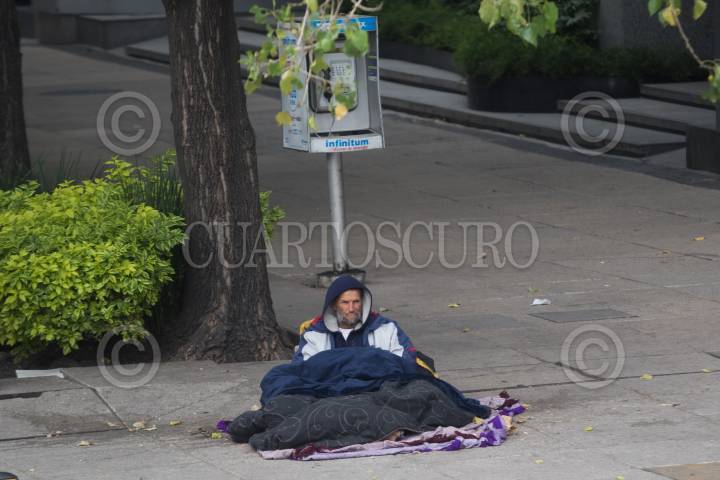 Un hombre que no tiene hogar se abriga con varias cobijas, en avenida Reforma.