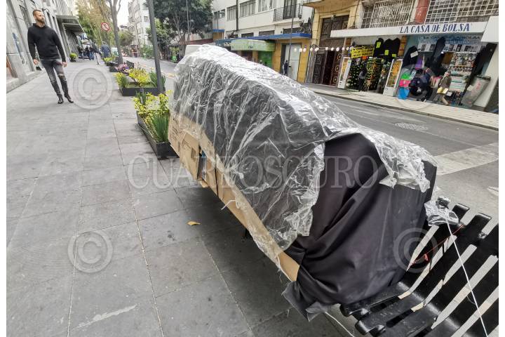 Ante las bajas temperaturas una persona sin hogar levanto un improvisado refugio con cartones, hules y telas, sobre una banca en la calle de Independencia.