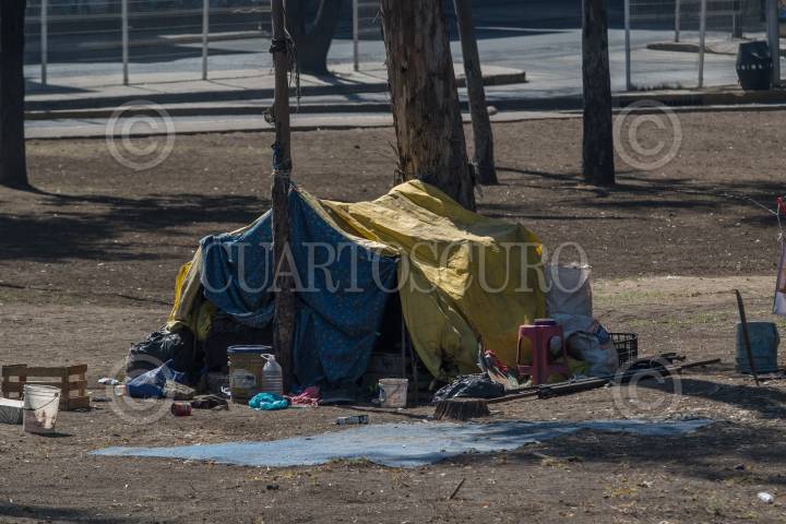 Una improvisada vivienda de una persona sin hogar se observa a un costado de avenida Insurgentes, a la altura de Montevideo.