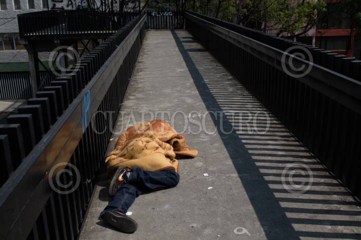 Hombre que no tiene casa utiliza de dormitorio el puente peatonal de Circuito Interior, a la altura del IPN.