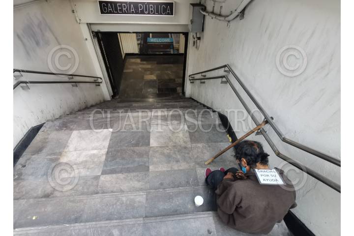 Una hombre que padece de sus facultades mentales pide ayuda económica en una solitaria escalera del metro Hidalgo.