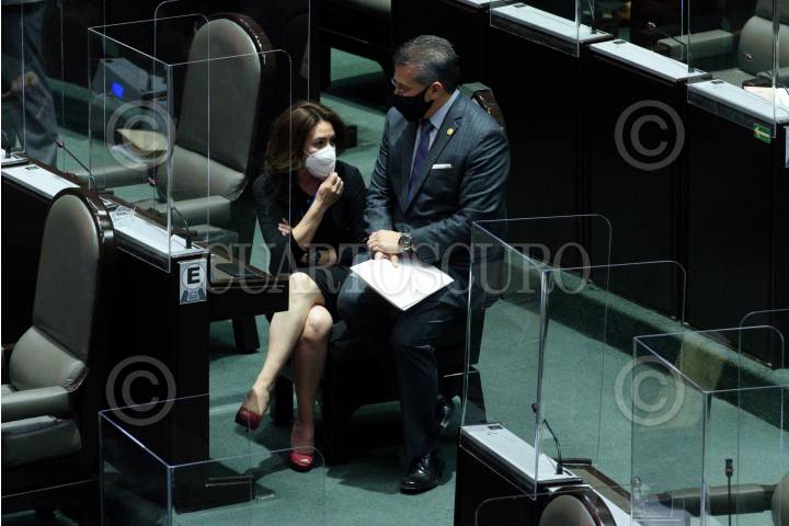 Rocío Barrera Badillo, presidenta de la comisión de Gobernación y Población, y Manuel Rodríguez González, presidente de la comisión de Energía, durante la discusión de la reforma a la Ley de la Industria Eléctrica.