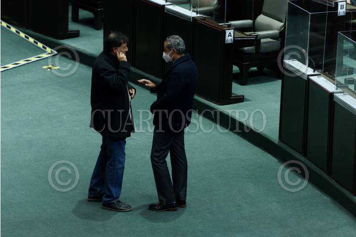 Gerardo Fernández Noroña, diputado del PT, y Enrique Ochoa Reza, diputado del PRI, dialogan durante la sesión ordinaria en la que se discute la reforma a la Ley de la Industria Eléctrica.