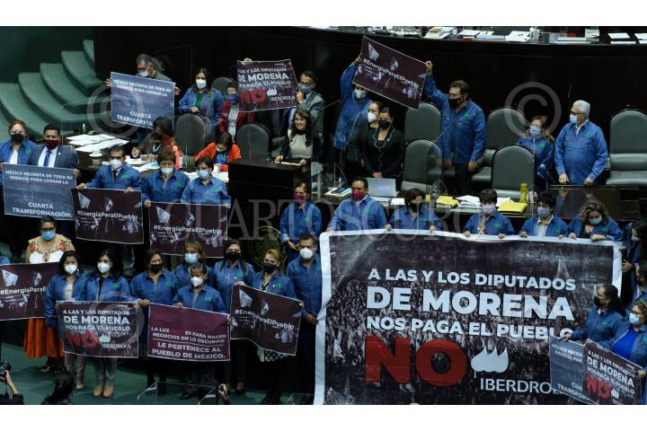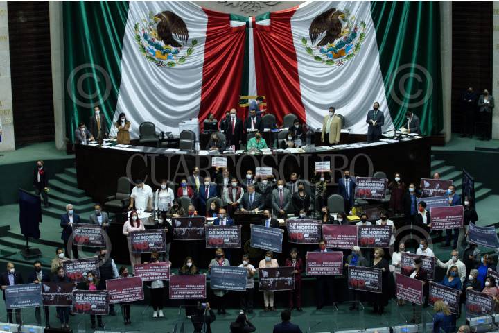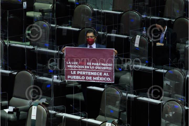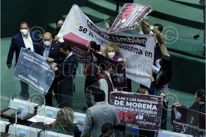 Integrantes del grupo parlamentario de Morena evitan que sea visible la pancarta del PRD en contra de la reforma a la Ley de la Industria Eléctrica que se discute en la sesión ordinaria de la Cámara de Diputados.