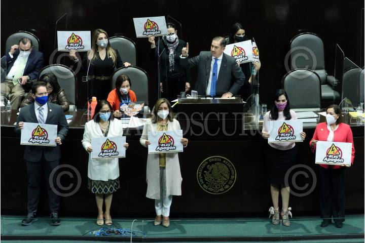 Integrantes del grupo parlamentario del PT evitan que sea visible la pancarta del PRD en contra de la reforma a la Ley de la Industria Eléctrica que se discute en la sesión ordinaria de la Cámara de Diputados.
