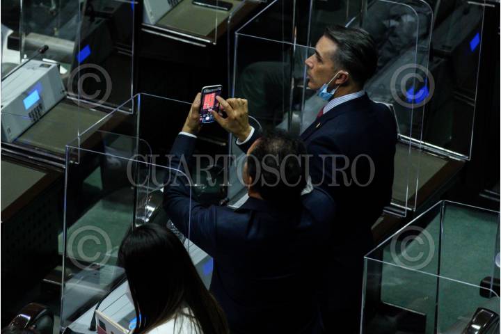 Ignacio Mier, diputado y coordinador de Morena, toma una fotografía del tablero en donde con 304 votos a favor, 179 en contra y 4 abstenciones fue aprobada en lo general la reforma a la Ley de la Industria Eléctrica.