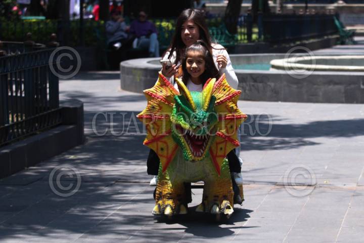 CIUDAD DE MÉXICO, 03AGOSTO2025.- Una mujer junto con una niña pasean en un coche eléctrico de dinosaurio en la Alameda de Santa María la Ribera. FOTO: GRACIELA LÓPEZ/CUARTOSCURO.COM