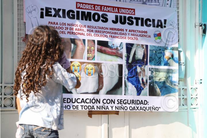 OAXACA DE JUÁREZ, OAXACA, 05MAYO2025.- Madres de familia de estudiantes del colegio Francois Dolto, ubicado en la capital de Oaxaca, se manifestaron al exterior del plantel para exigir justicia para 8 menores que resultaron con quemaduras de segundo y tercer grado durante una actividad escolar el pasado 29 de abril. Denunciaron que luego del incidente provocado por una fogata, los directivos y la plantilla docente tardaron horas en contactarlos, la actividad continuó y luego de trasladar a los heridos a diversos servicios médicos, no han tenido acercamiento ni apoyo, pese a que la institución cobra un seguro de vida por alumno al inicio del ciclo escolar. Exigieron por ello a las autoridades se revisen los permisos de operación del colegio, además de las investigaciones correspondientes y reparación del daño. Hay cuatro niños en estado grave de salud. FOTO: CAROLINA JIMÉNEZ/CUARTOSCURO.COM